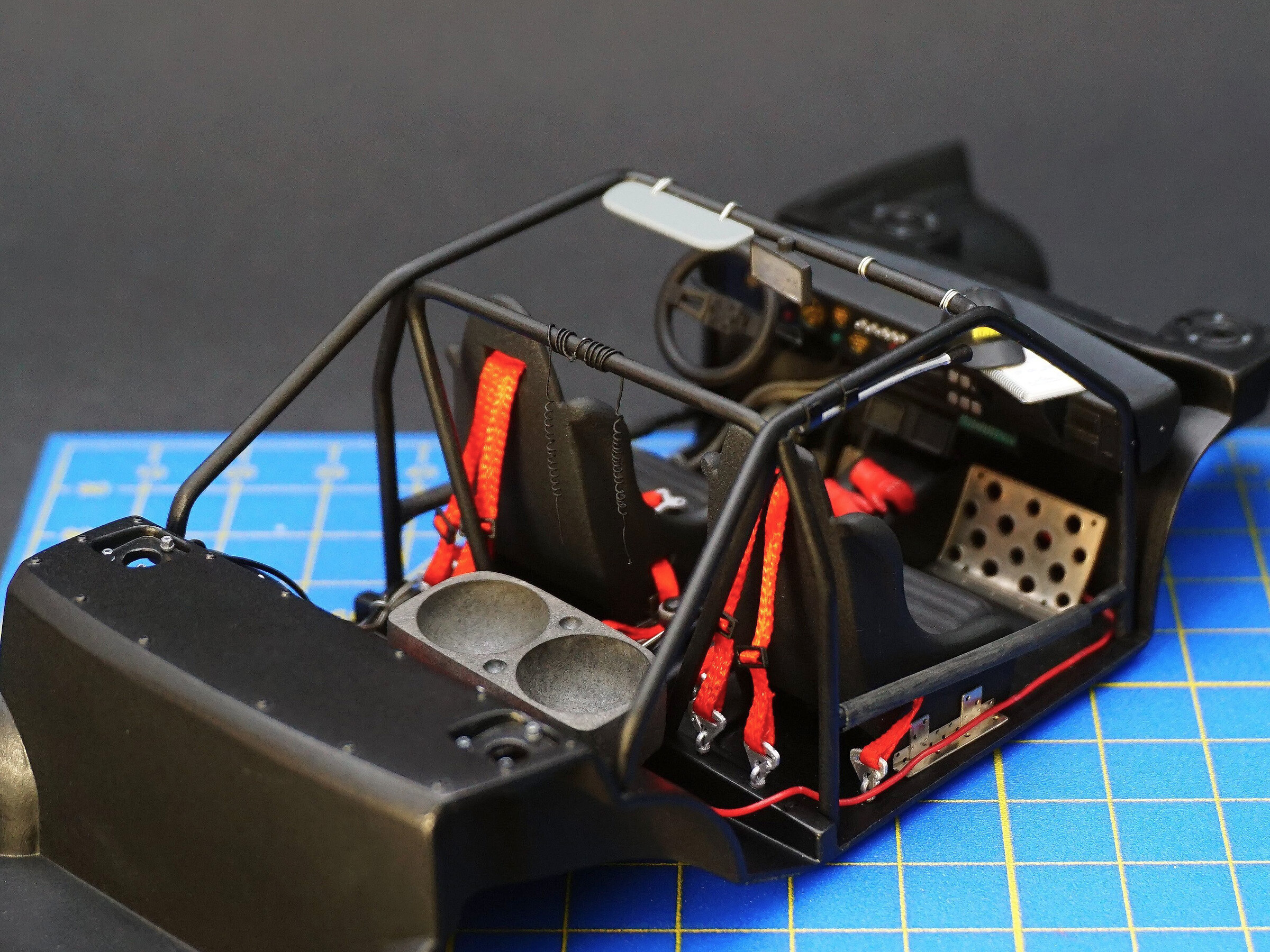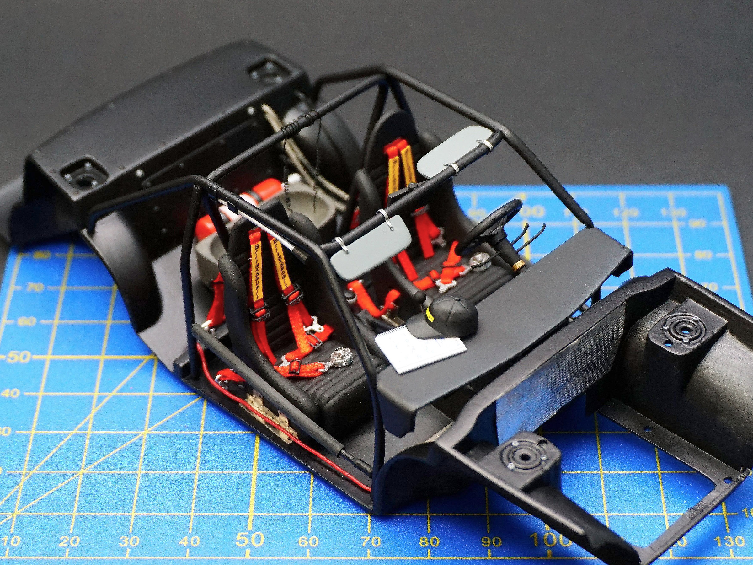 Work on the seats. To make the rally buckets look good, their shape had to be refined and the sides had to be drilled for the seat belts. I painted the seats with Humbrol matte black and matte clear, also from Humbrol. The mounts come from the Renaissance TK24/202 valorization set.