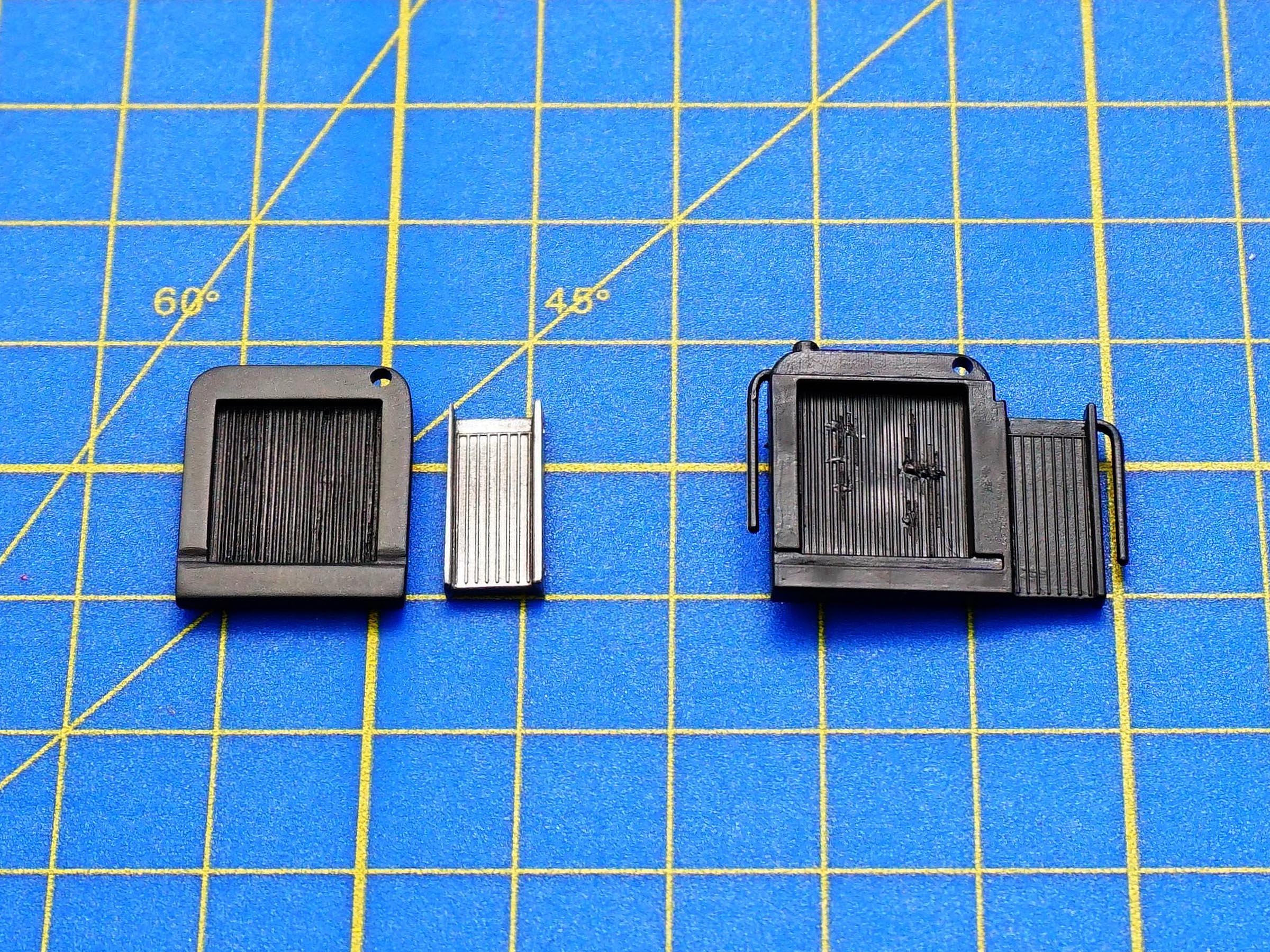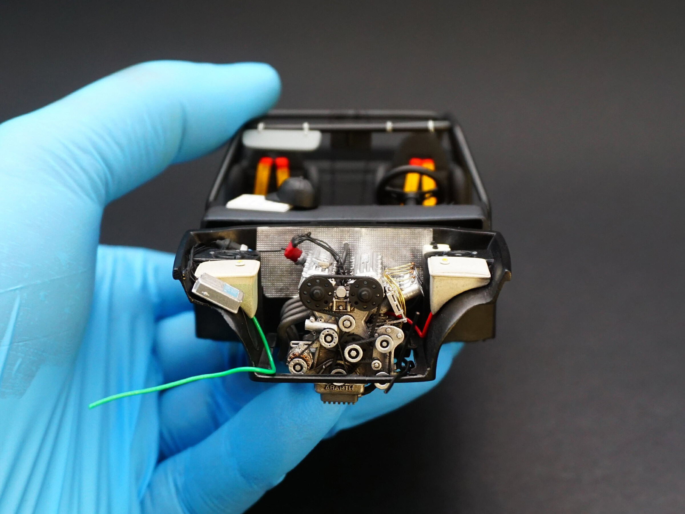 The license plate is a modified Mini Cooper plate and an appropriately cut decal from the Fiat set. The hood latches are a SCO product - (SCO-R016). I made the rubber cover of the trunk lid lock from a 1,0 mm rivet with a round head - (SCO-R024). The towing hitch is the Renaissance TK24/202 valorization set.