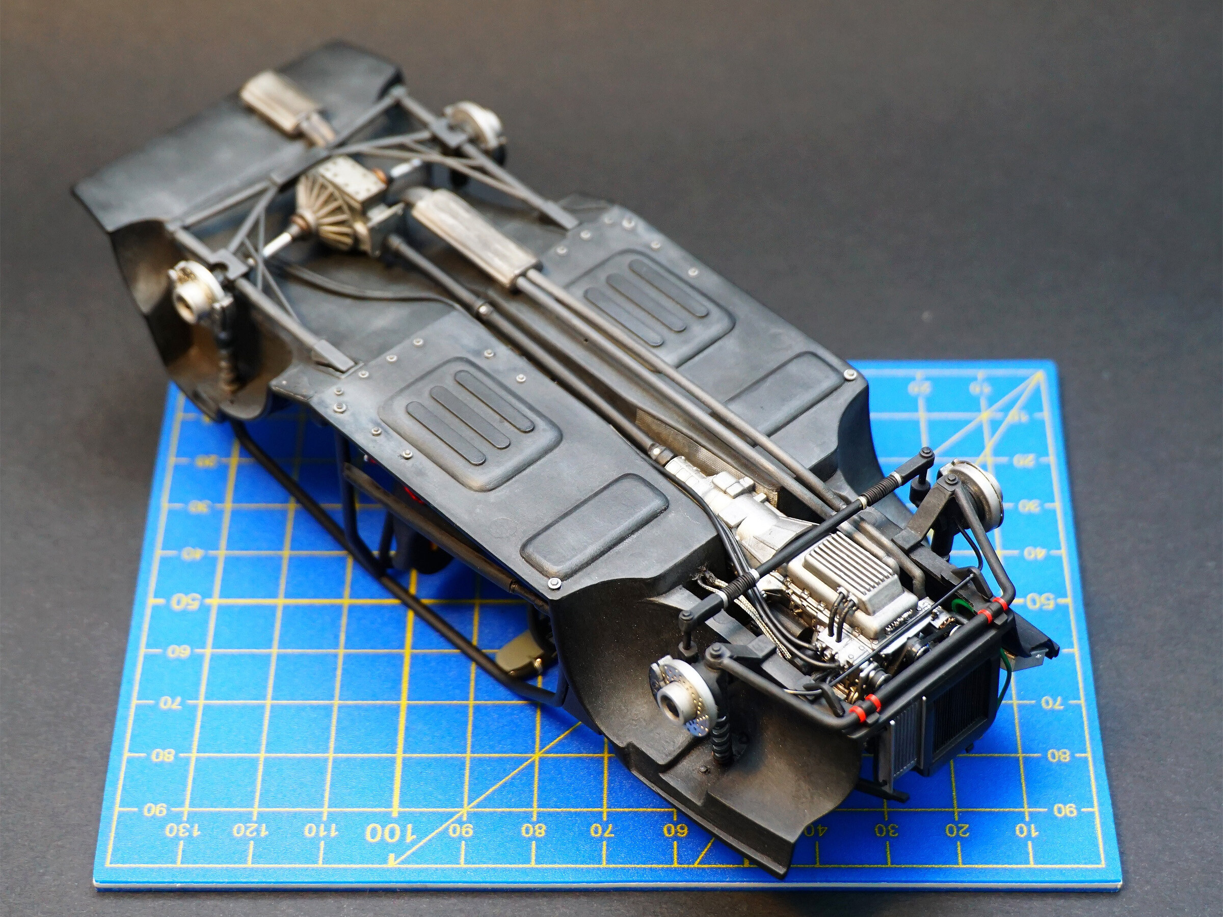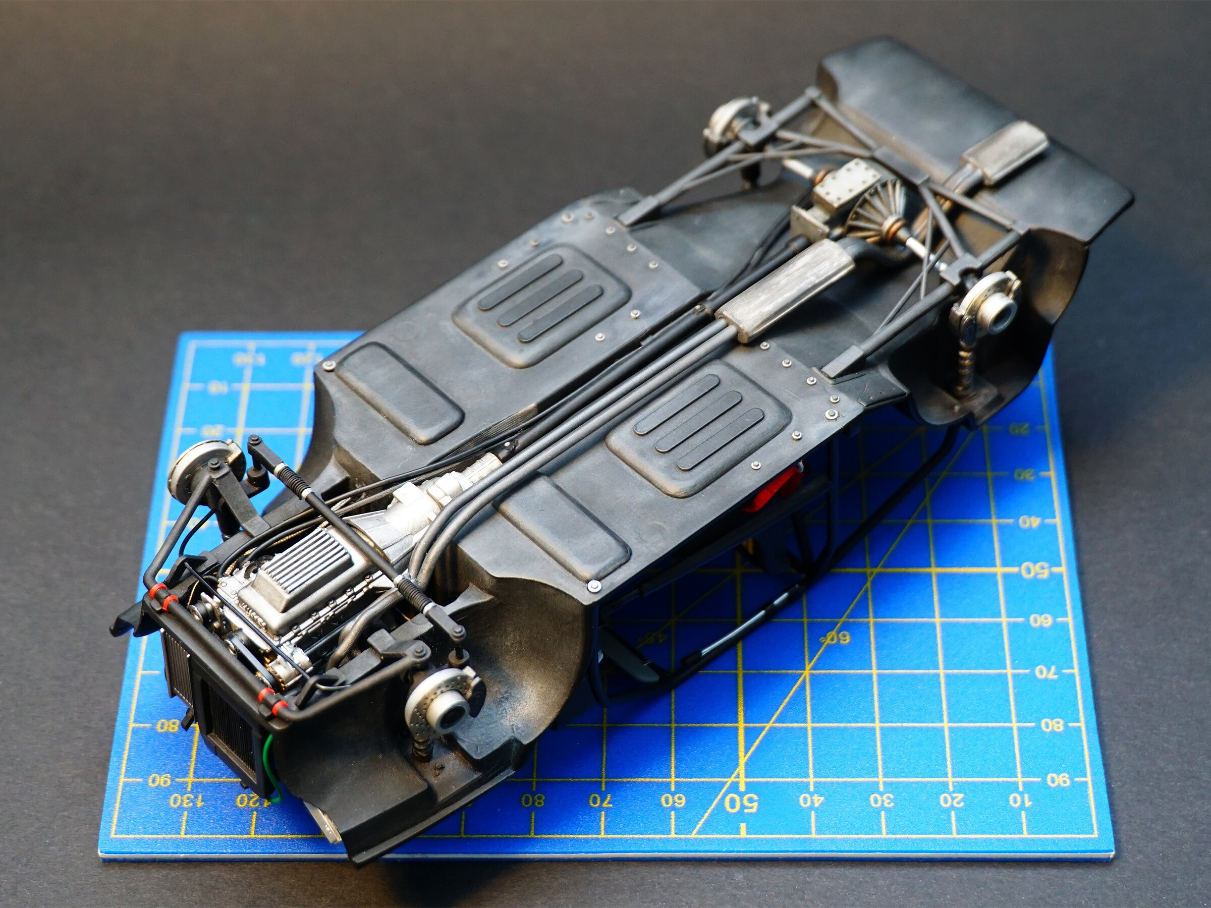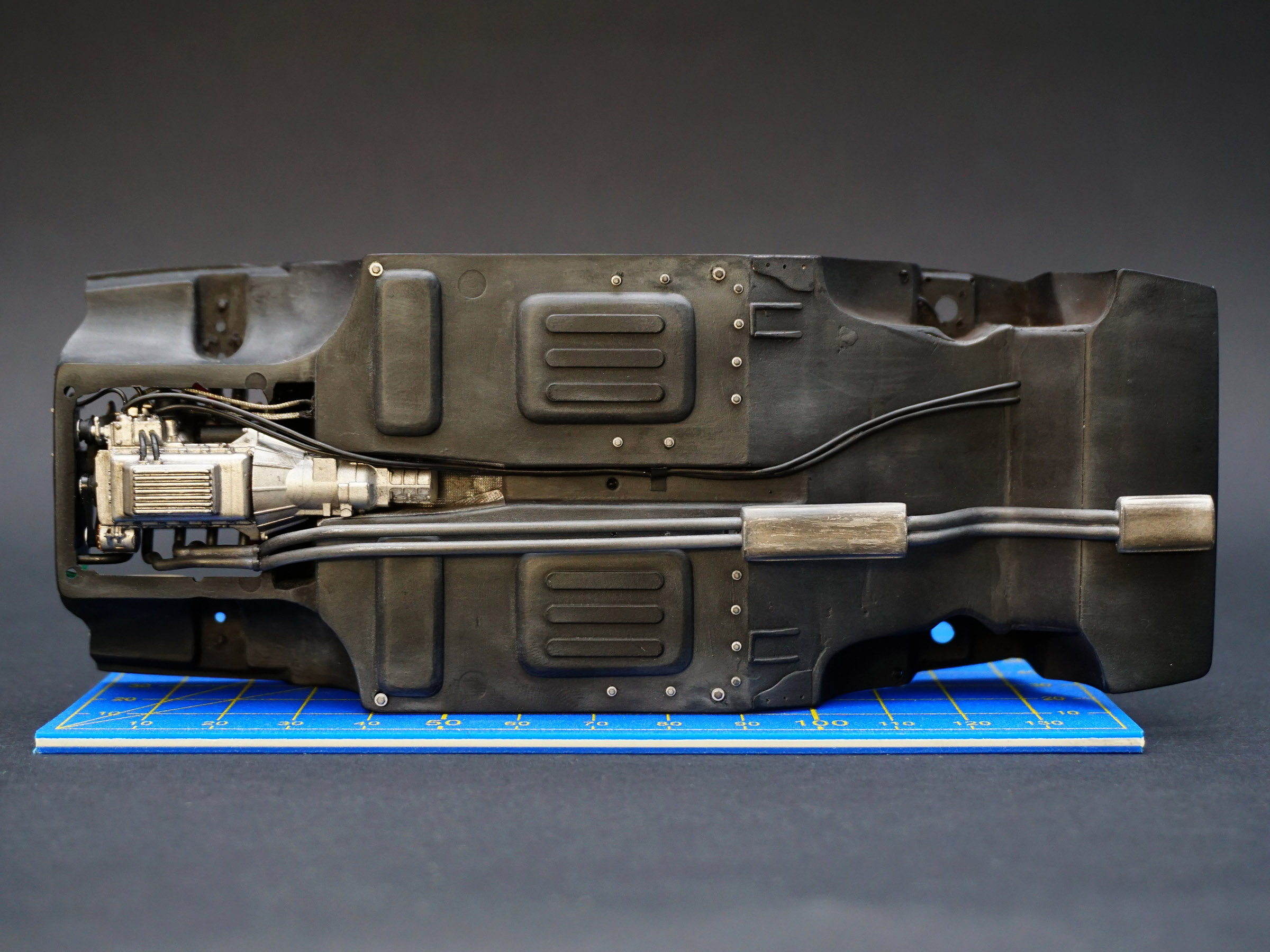 Work on the chassis. The floor pan required many modifications (like everything on this model) - an additional cover for the rear bulkhead, a removed front panel in the engine compartment, numerous reamings for belts, fuel lines and electrical wiring. Additionally, I plugged the hole in the rear part of the chassis.