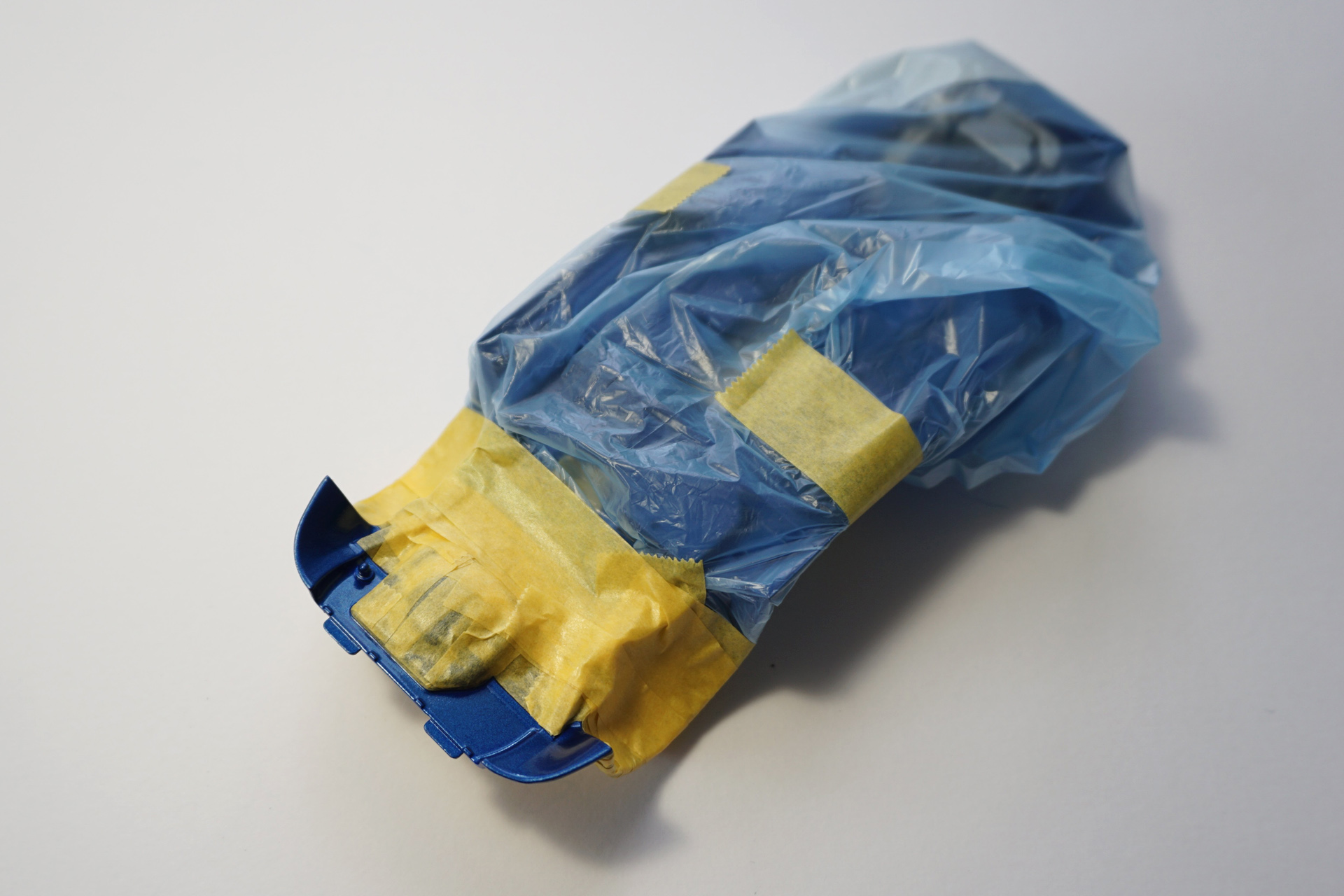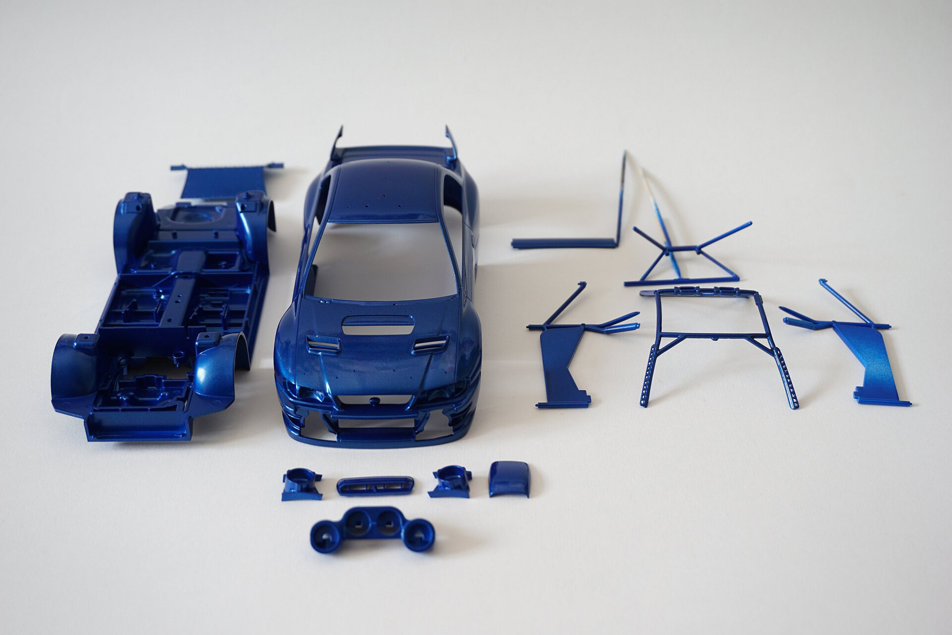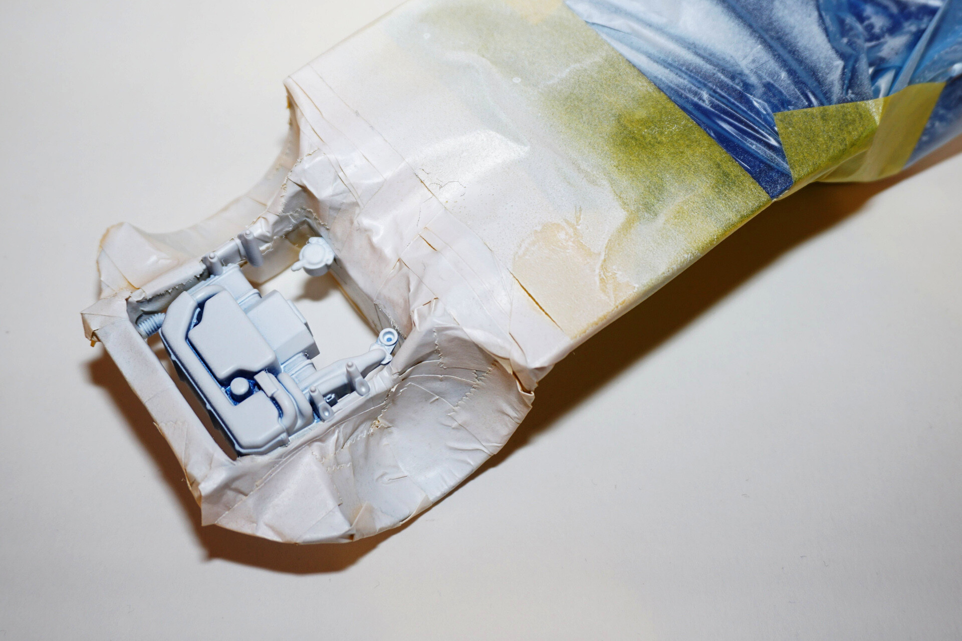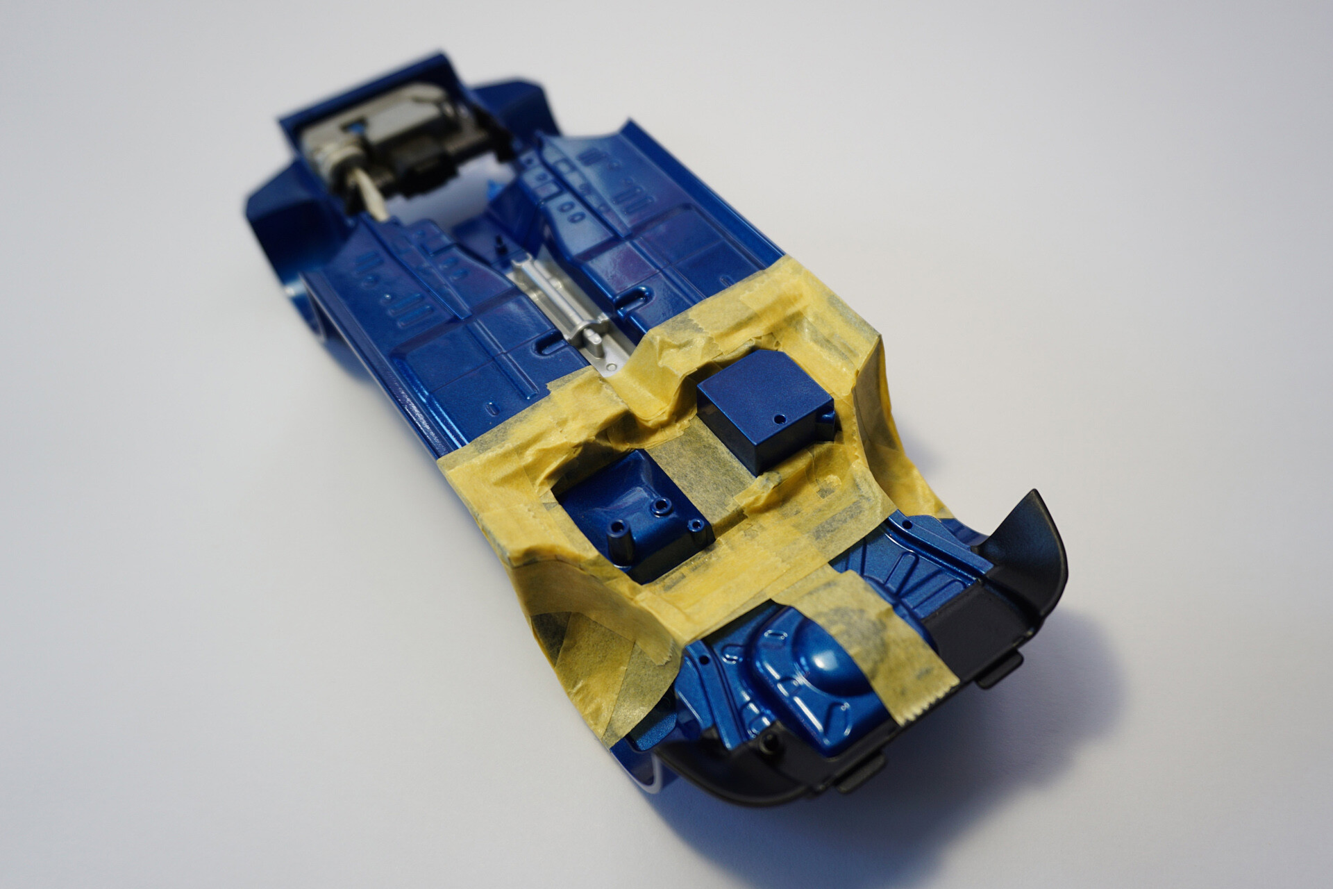 The next stage of work is masking, black painting and wrapping the panels with carbon. The decals were painted with TS-71 Smoke to darken their shade which was too silver. Then several layers of TS-13.