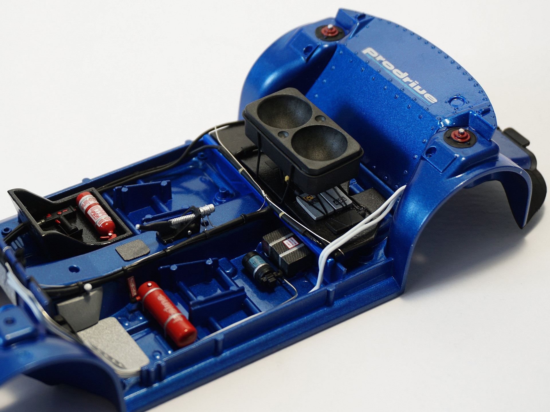 The nets, pocket recesses and the handle on the driver's side had to be removed from side panels, as these did not match the specification of the model I am making. The whole was painted with black mat, then masking and half-mat painting of the door panels.